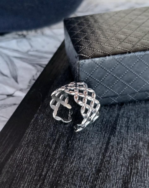 Bague ajustable « Croisillons » en acier inoxydable (stainless steel) Design : anneau ouvert, large bande ajourée formée d’un motif géométrique répétitif de croisillons.