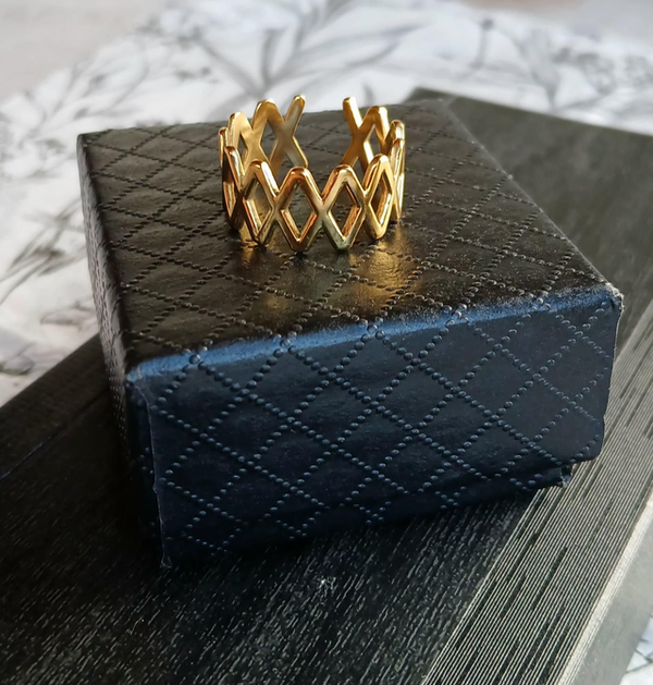 Le motif en résille crée un jeu de pleins et de vides, avec des lignes fines et régulières qui dessinent une frise géométrique tout autour du doigt. Finition & matière : base en métal recouverte d’un plaqué or 18 carats (3 microns généralement pour un plaqué de qualité), finition lisse et brillante qui capte la lumière avec un éclat chaud et lumineux. Le rendu doré est uniforme, sans aspérité, pour un effet bijou précieux. Forme & confort : bande d’environ 9–11 mm de hauteur, profil légèrement bombé sur l’extérieur et bords adoucis à l’intérieur pour un porté agréable.